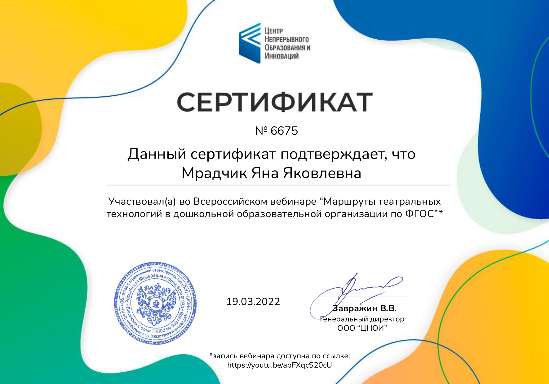 Сертификат вебинара "Маршруты театральных технологий в ДОО по ФГОС"