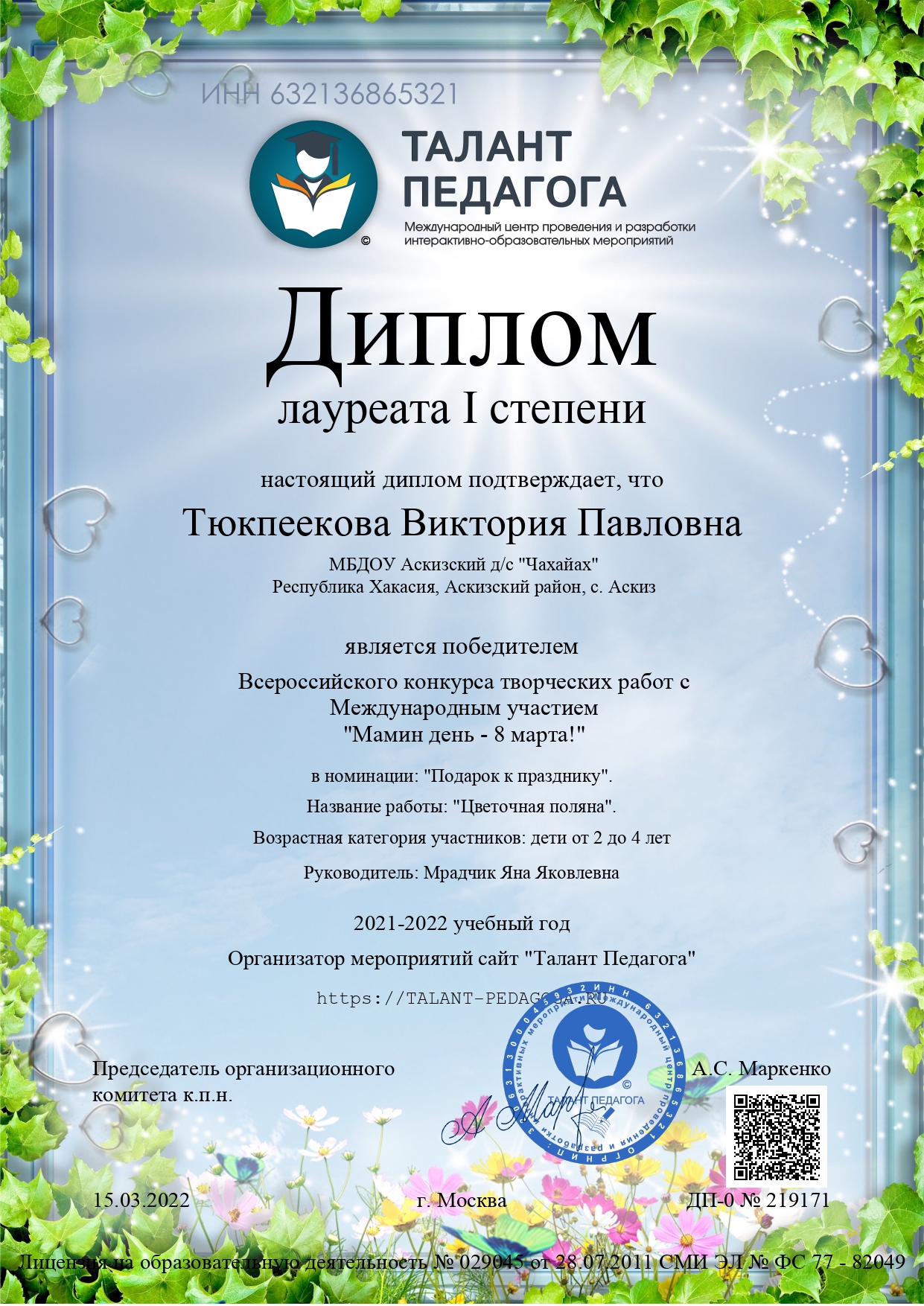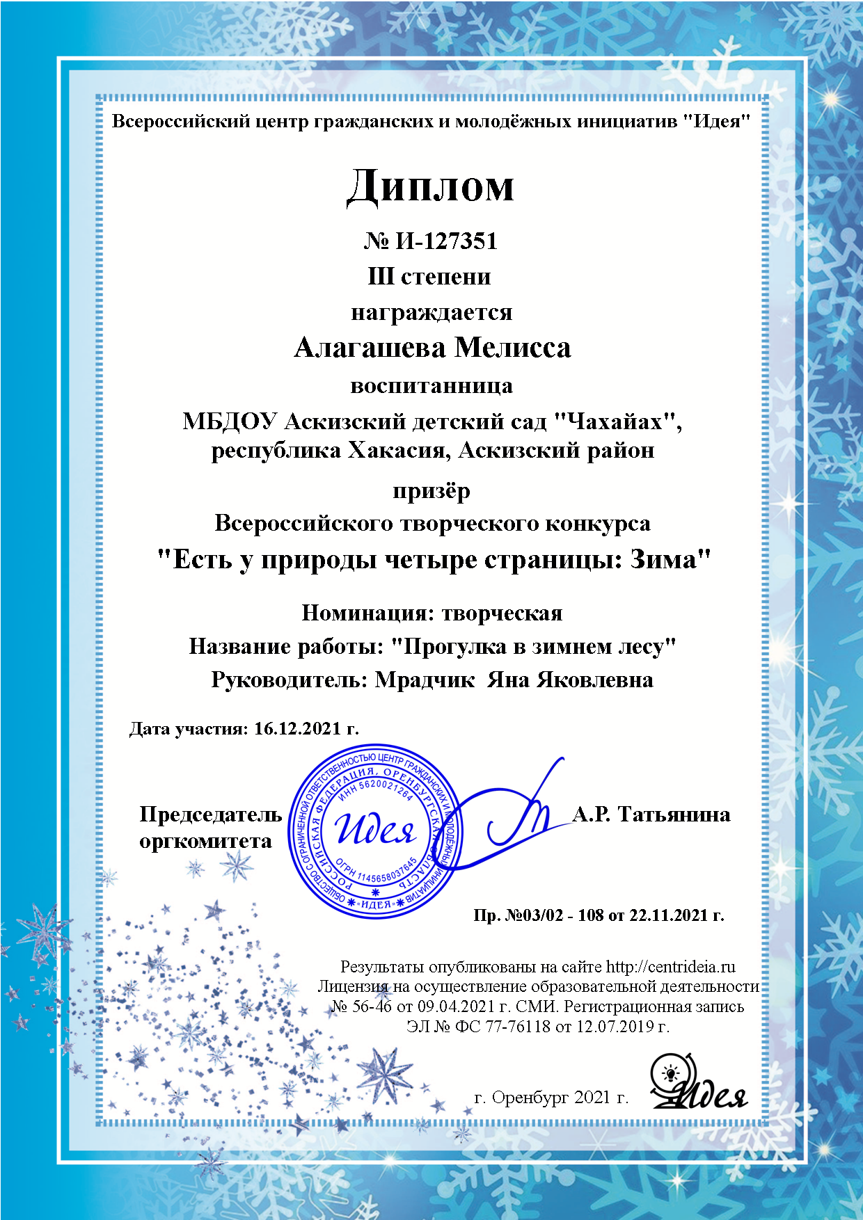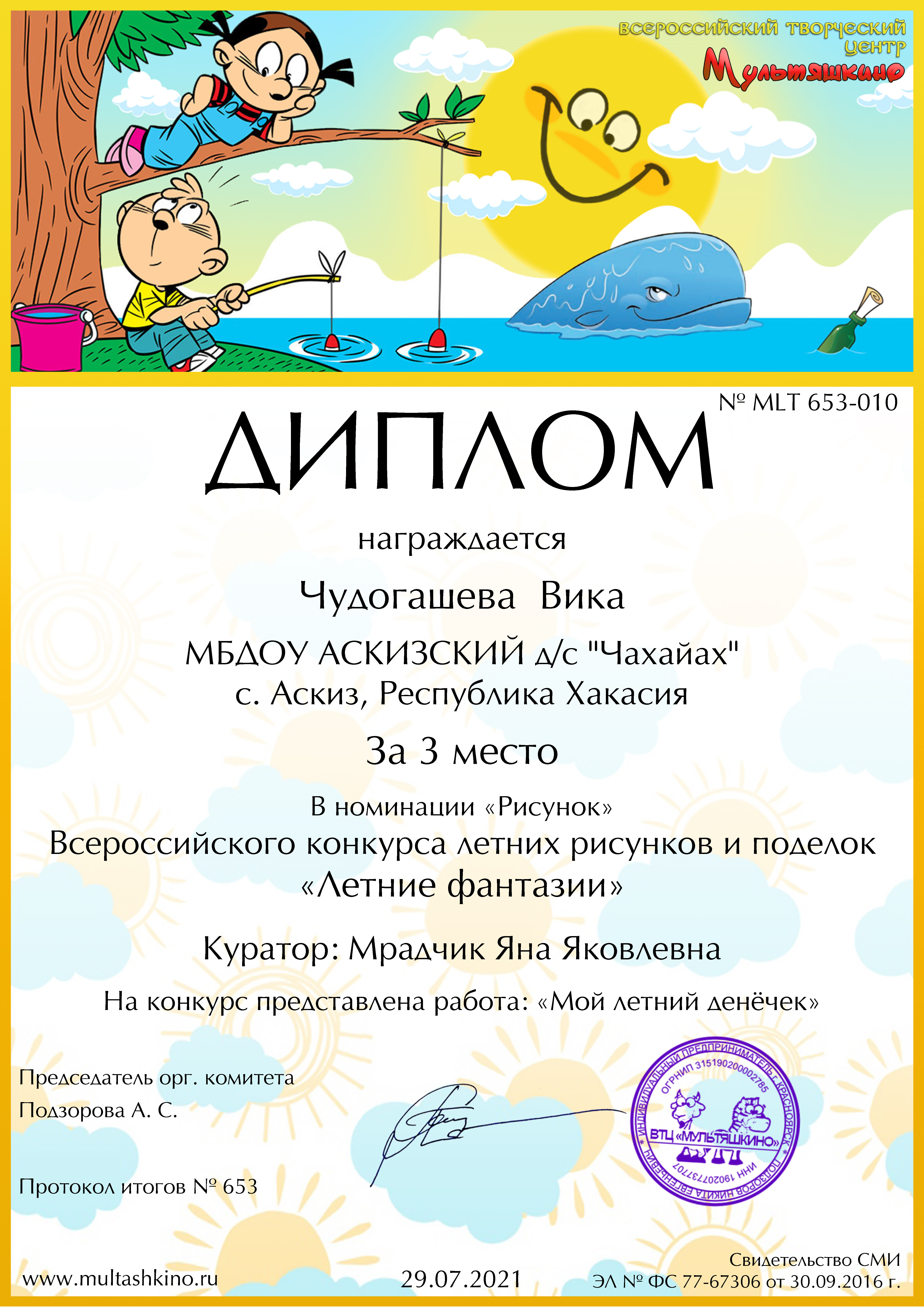 Диплом за 3 место "Летние фантазии" Чудогашева Вика