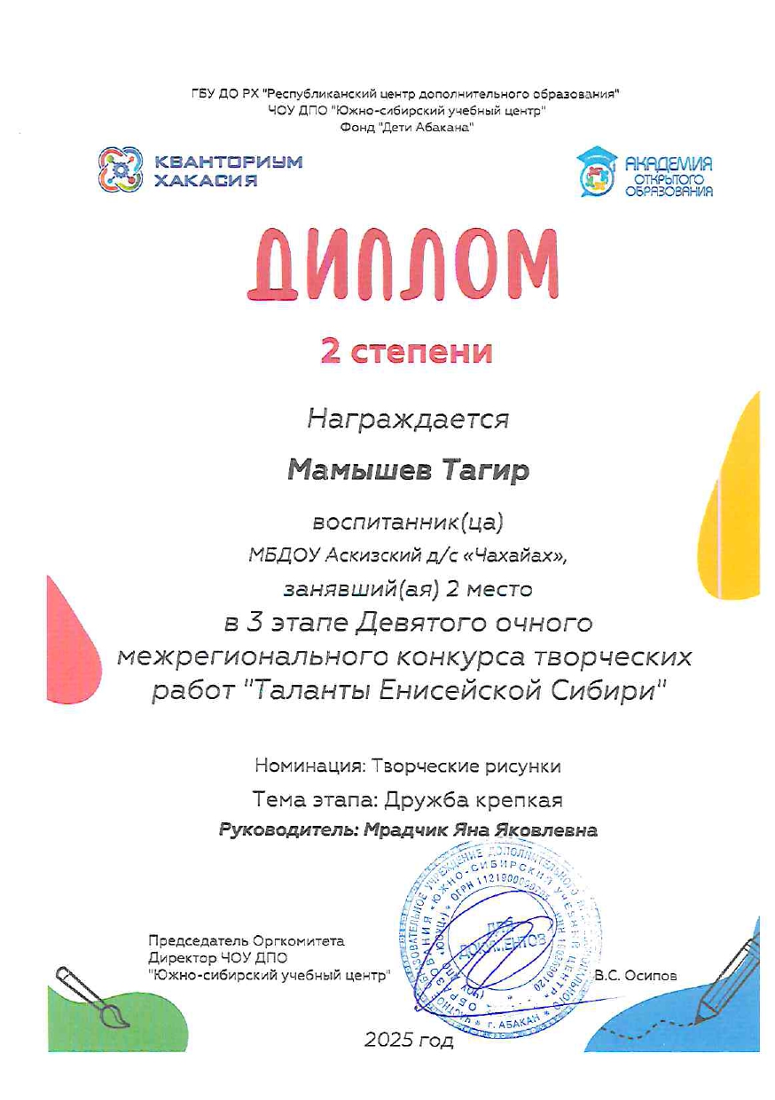 Диплом 2 степени Мамышев Тагир Межрегиональный конкурс творческих работ "Таланты Енисейской Сибири"