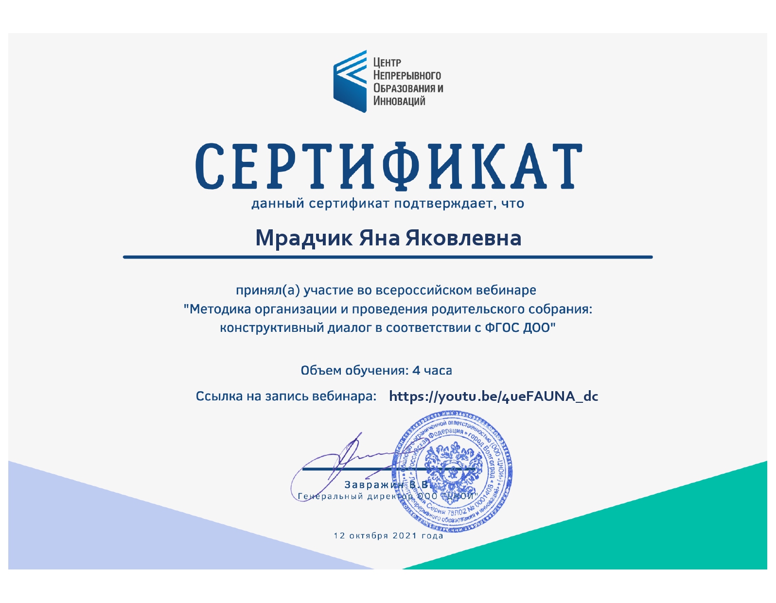 Сертификат "Методика организации и проведения родительского собрания: конструктивный диалог в соответствии ФГОС ДОО"