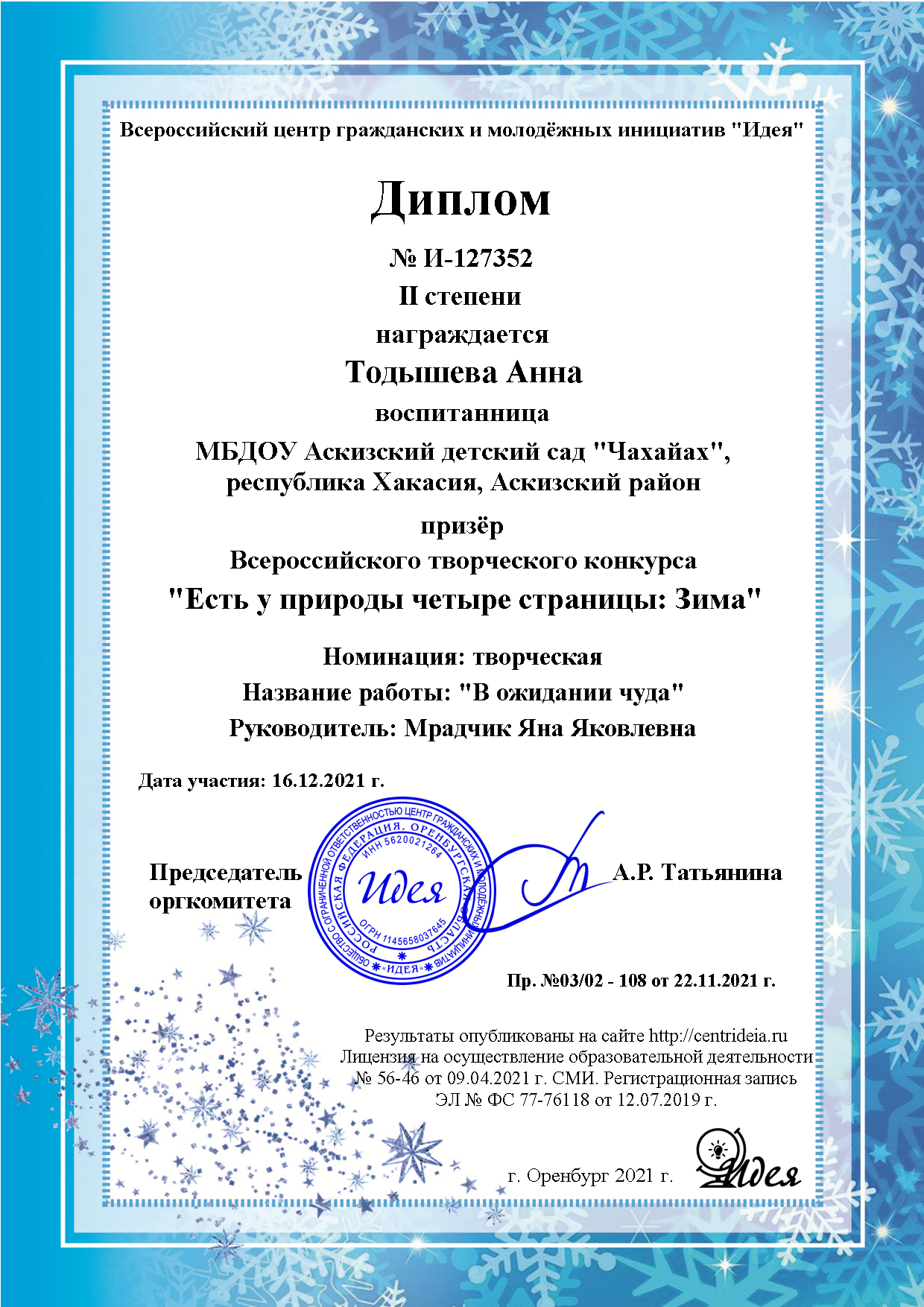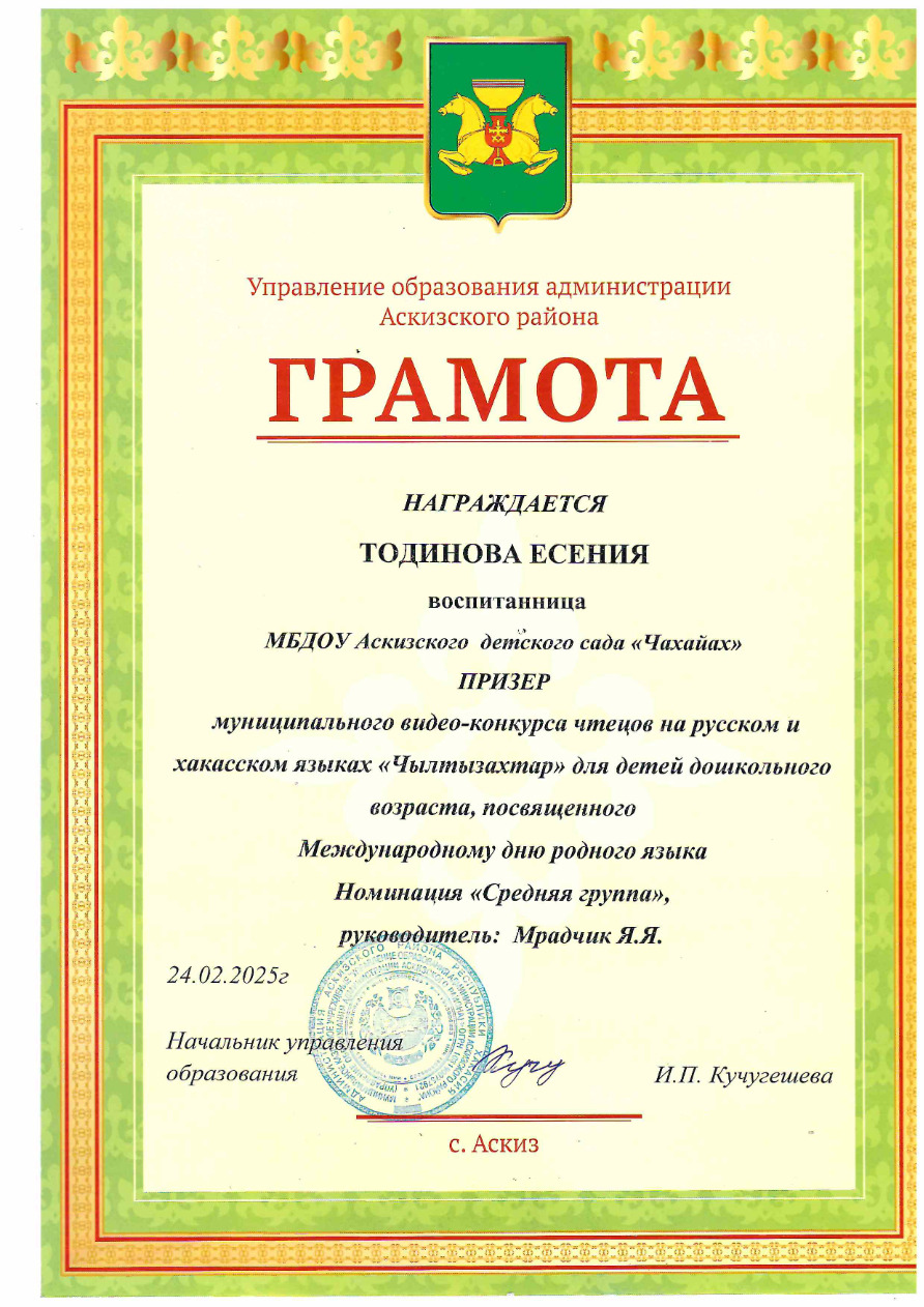 Грамота Тодинова Есения призер муниципального конкурса чтецов на русском и хакасском языке "Чылтызахтар"