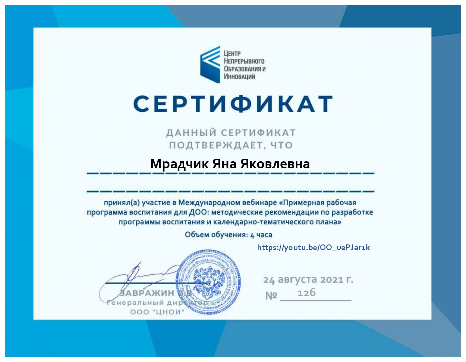 Сертификат международного вебинара "Примерная рабочая программа воспитания для ДОО"