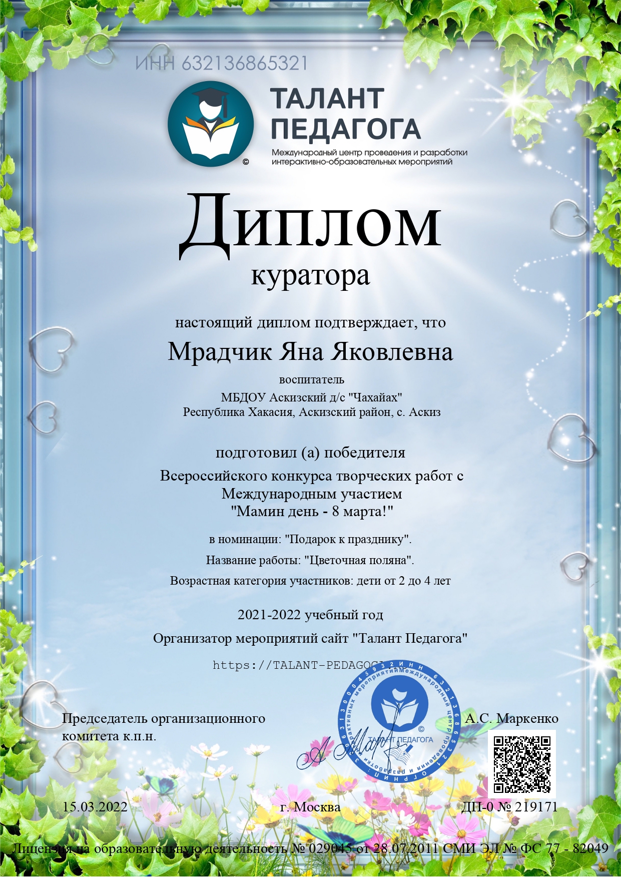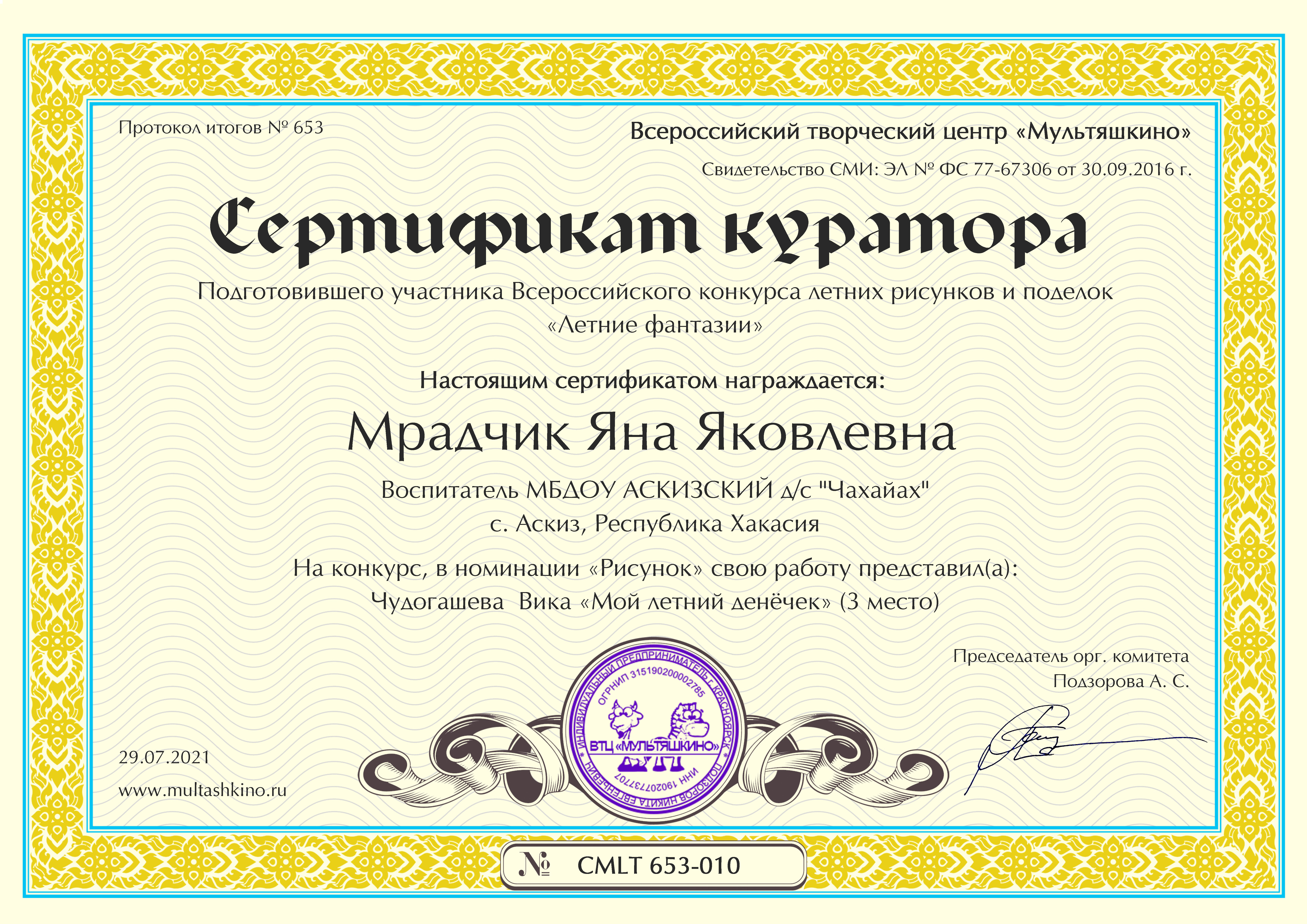 Сертификат куратора Всероссийского конкурса летних рисунков и поделок "Летние фантазии".