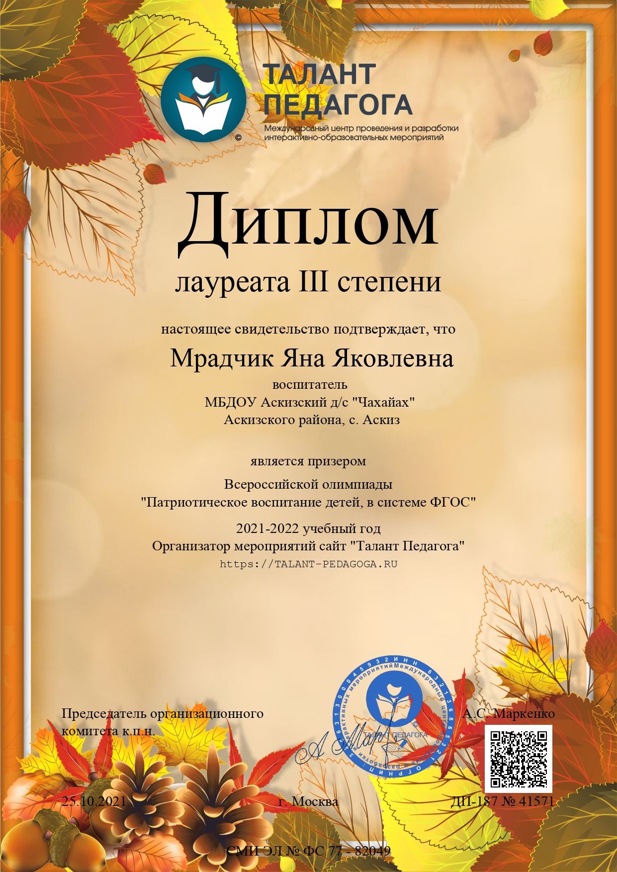 Диплом лауреата III степени Всероссийская олимпиада "Патриотическое воспитание детей, в системе ФГОС"