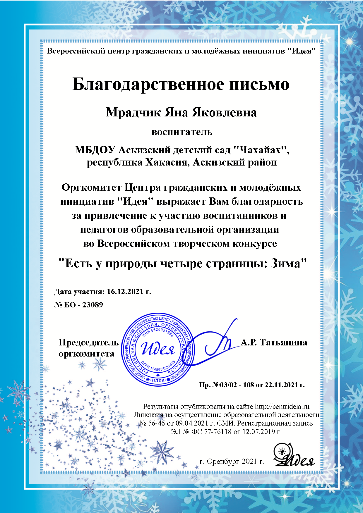 Благодарственное письмо " Есть у природы четыре страницы:Зима"