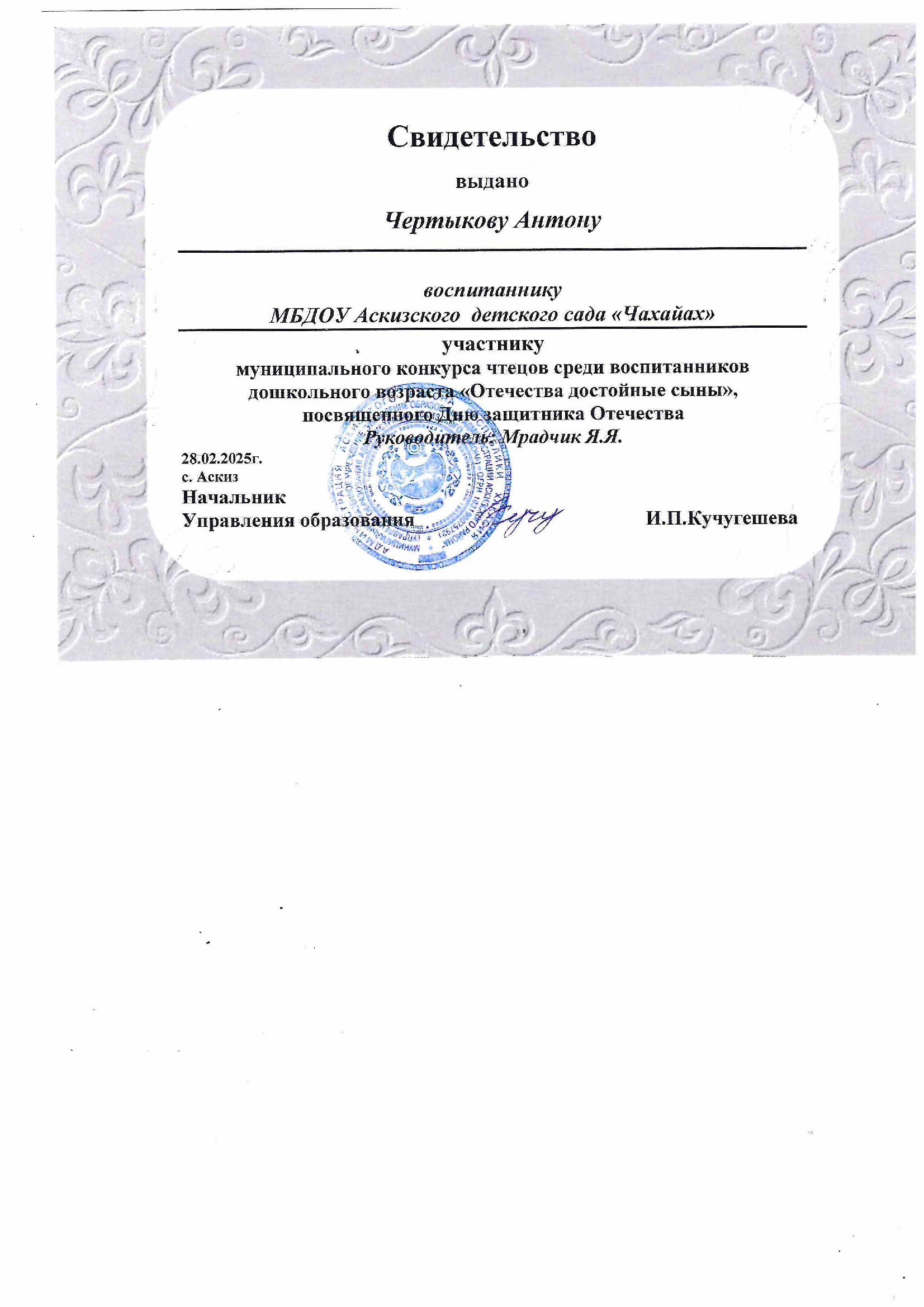 Свидетельство Чертыкову Антону участнику Муниципального конкурса четов "Отечества достойные сыны"