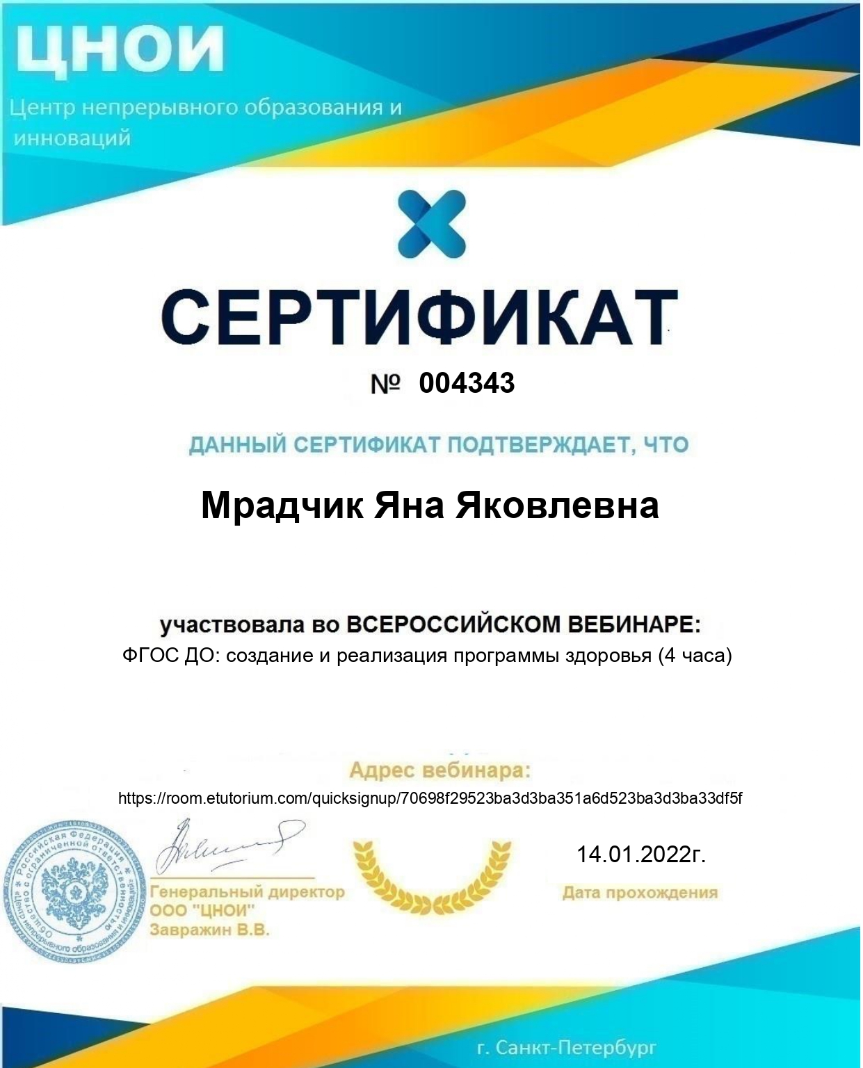 Сертификат Всероссийского вебинара "ФГОС ДО: создание и реализация программы здоровья"