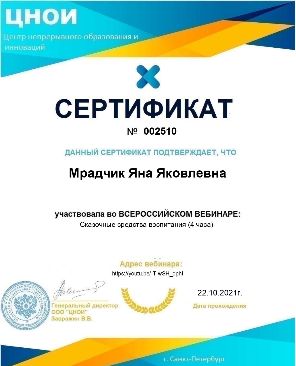 Сертификат Всероссийского вебинара "Сказочные средства воспитания"